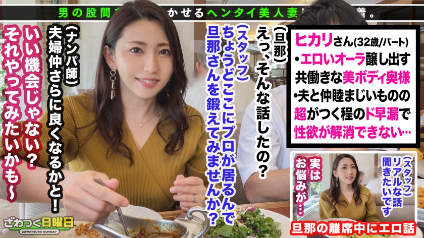 「刺激が欲しい」という主婦の密かな性欲を暴く本企画。今回のターゲットは、豊島区のラブホテル街で声をかけた結婚生活3年目の夫婦です。夫が極度の早漏であることに不満を抱く妻のヒカリさんは、専門家(AV男優)による技術指導と聞き、夫を説得して撮影に協力することに。ベッドの上では、基本的なフェラチオやクンニから始まり、夫の目の前で他人の挿入を許す背徳のレッスンが繰り広げられます。多角的な体位での交わりの後、舞台はオイル塗れの3Pへと変貌。複数の男に翻弄されながら、背面座位やディープキスで理性を失っていくヒカリさん。中出しを含む合計5回の射精を身体に刻み込まれ、欲求不満だった普通の奥様は、どろどろの快感の中でその本性を露呈させました。